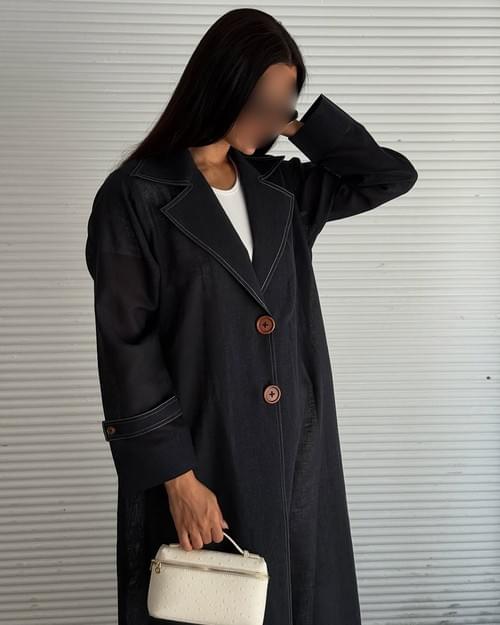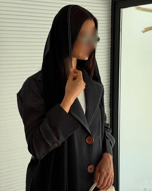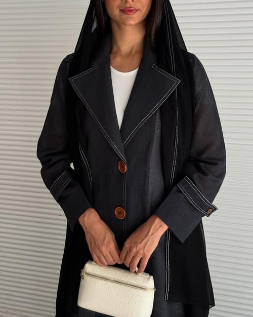 Make a powerful statement with our tailored Blazer Abaya, where minimalist elegance meets bold design. Crafted from 100% pure black linen, this piece is dramatically accentuated by bright white contrast stitching along the lapels, cuffs, and major seam lines. This intentional detailing highlights the garment's sharp structure, transforming it from a simple cover-up into a modern fashion statement for your summer and resort collections.