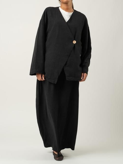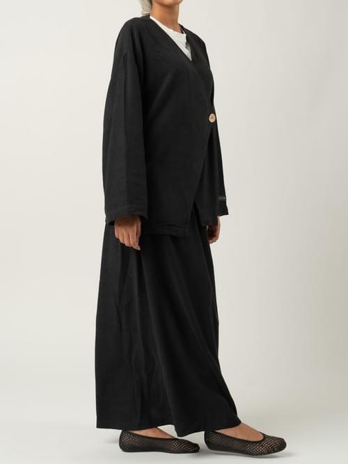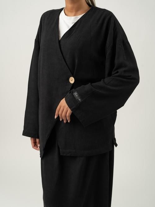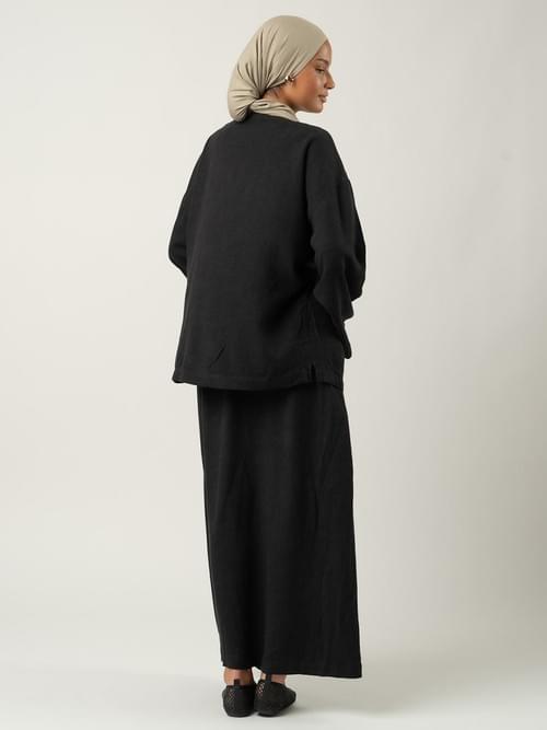 This timeless two-piece abaya set exemplifies modern modest wear through its minimalist design. Featuring a sleek black abaya jacket secured with a single, statement gold button, paired with a perfectly matching A-line skirt. Designed for fashion brands seeking a versatile and sophisticated foundation for their collection.